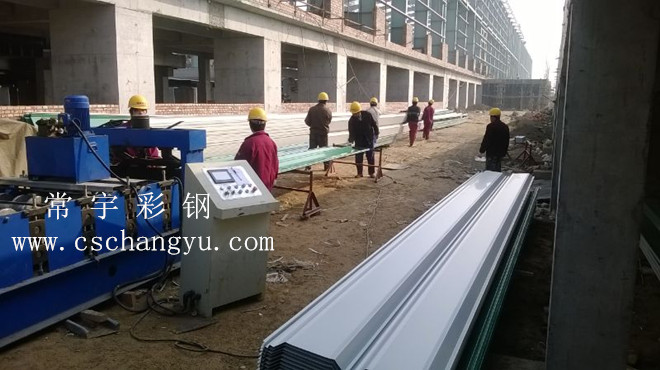 發(fā)布時(shí)間:2013-12-15來(lái)源:常宇彩鋼作者:常宇彩鋼瀏覽次數(shù):(0) 經(jīng)過(guò)雙方友好協(xié)議,2013.10月20號(hào)760設(shè)備到達(dá)山東工地現(xiàn)場(chǎng),我司派一名操作技師現(xiàn)場(chǎng)壓型,與施工單位互相配合,滿足工程安裝需求。材料名稱為760型暗扣式鋁鎂錳屋面板。長(zhǎng)度長(zhǎng)達(dá)16m。