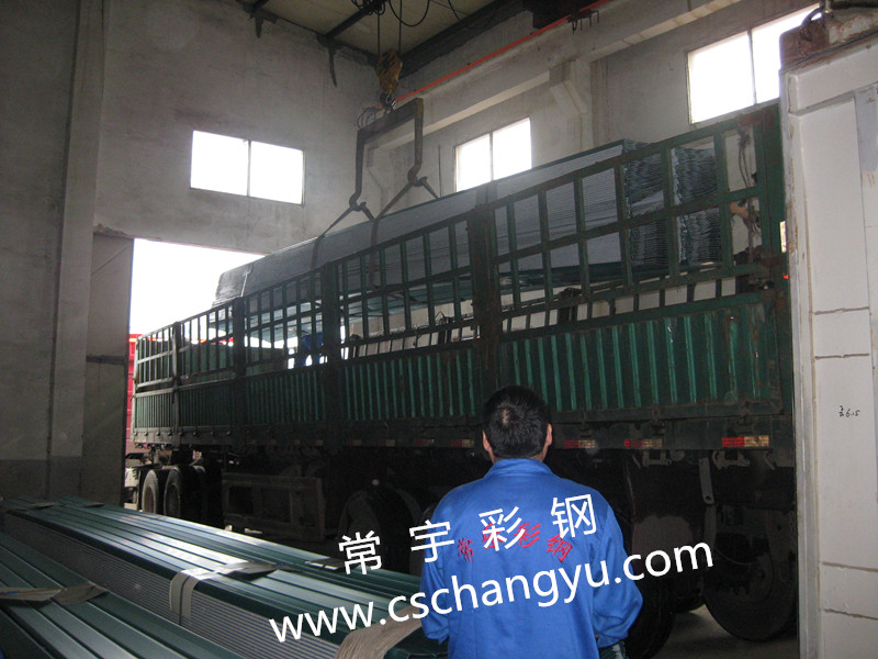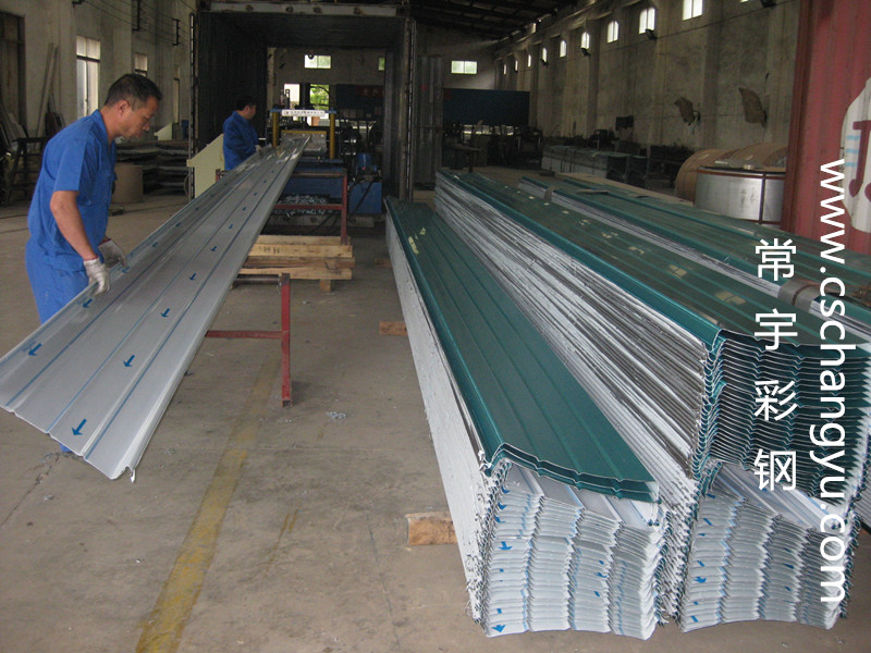 圖為長(zhǎng)沙常宇彩鋼430型直立鎖邊鋁鎂錳板裝車中