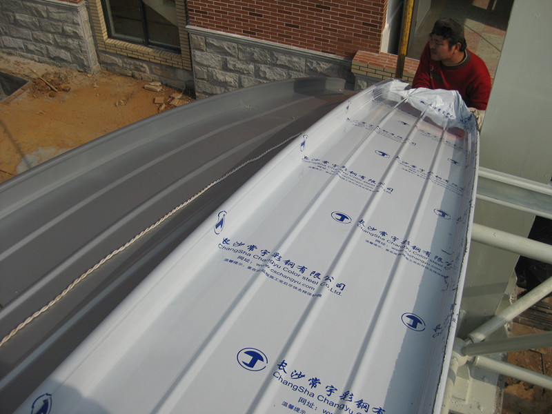 直立鎖邊鋁鎂錳:先直板再?gòu)澔;¢L(zhǎng)8.6m,拱高800mm。