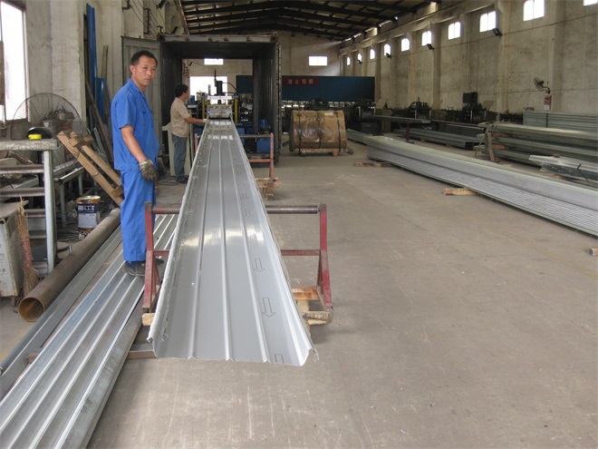 永州YX65/430直立鎖邊鋁鎂錳板生產(chǎn)實拍 板長18m