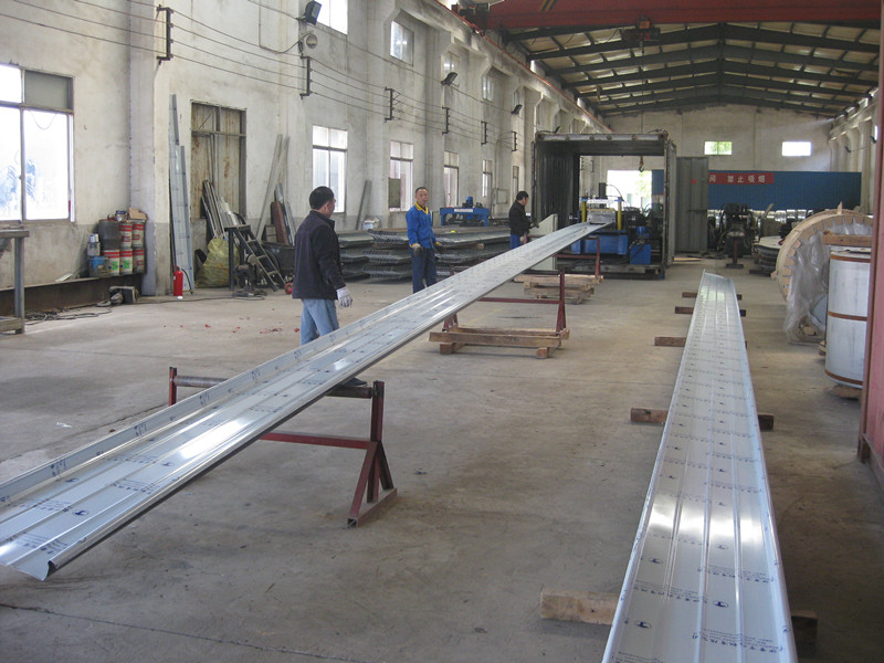 圖為長沙常宇彩鋼生產(chǎn)直立鎖邊鋁鎂錳板,板長達17米。銀色鋁鎂錳板。